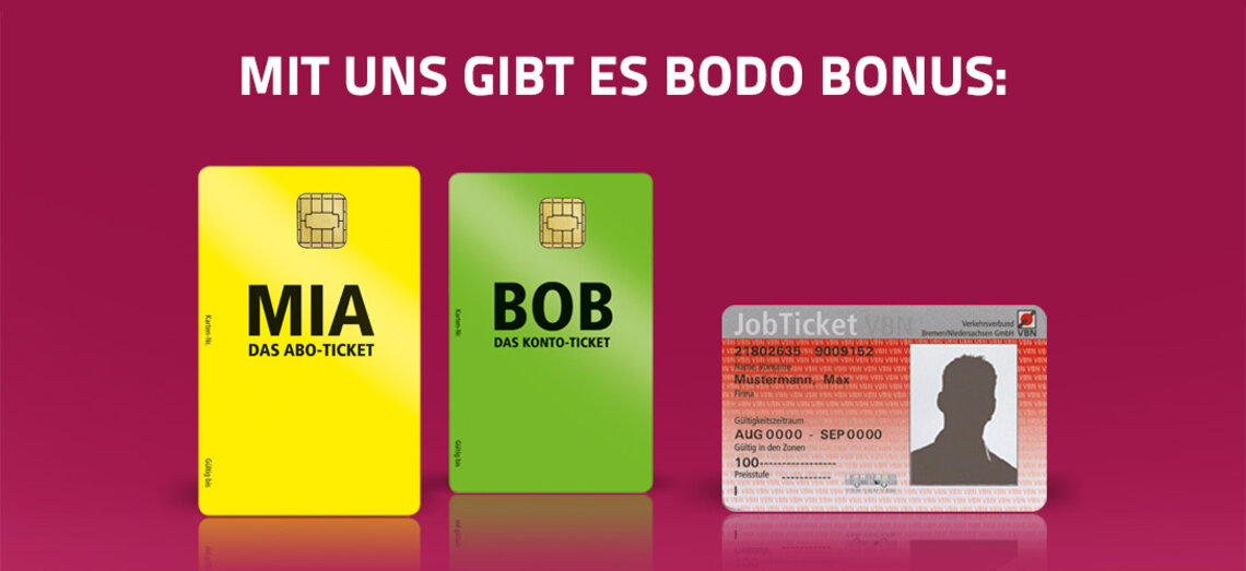 Sie sind noch kein MIA- oder BOB-Kunde? Dann lassen Sie sich in einem unserer Kundencenter beraten: Welches Ticket passt am besten zu Ihnen? Werden Sie einfach Kunde bei uns – dann erhalten Sie Mobilität rund um die Uhr und außerdem das BODO BONUS-Heft mit den vielen zusätzlichen Vorteilen!